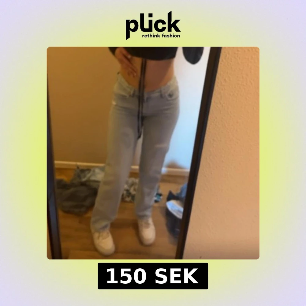 Säljer ett par ljusblå jeans med rak passform och klassisk femficksdesign. Jeansen har låg midja och är tillverkade i denim. Perfekta för en avslappnad och trendig look.