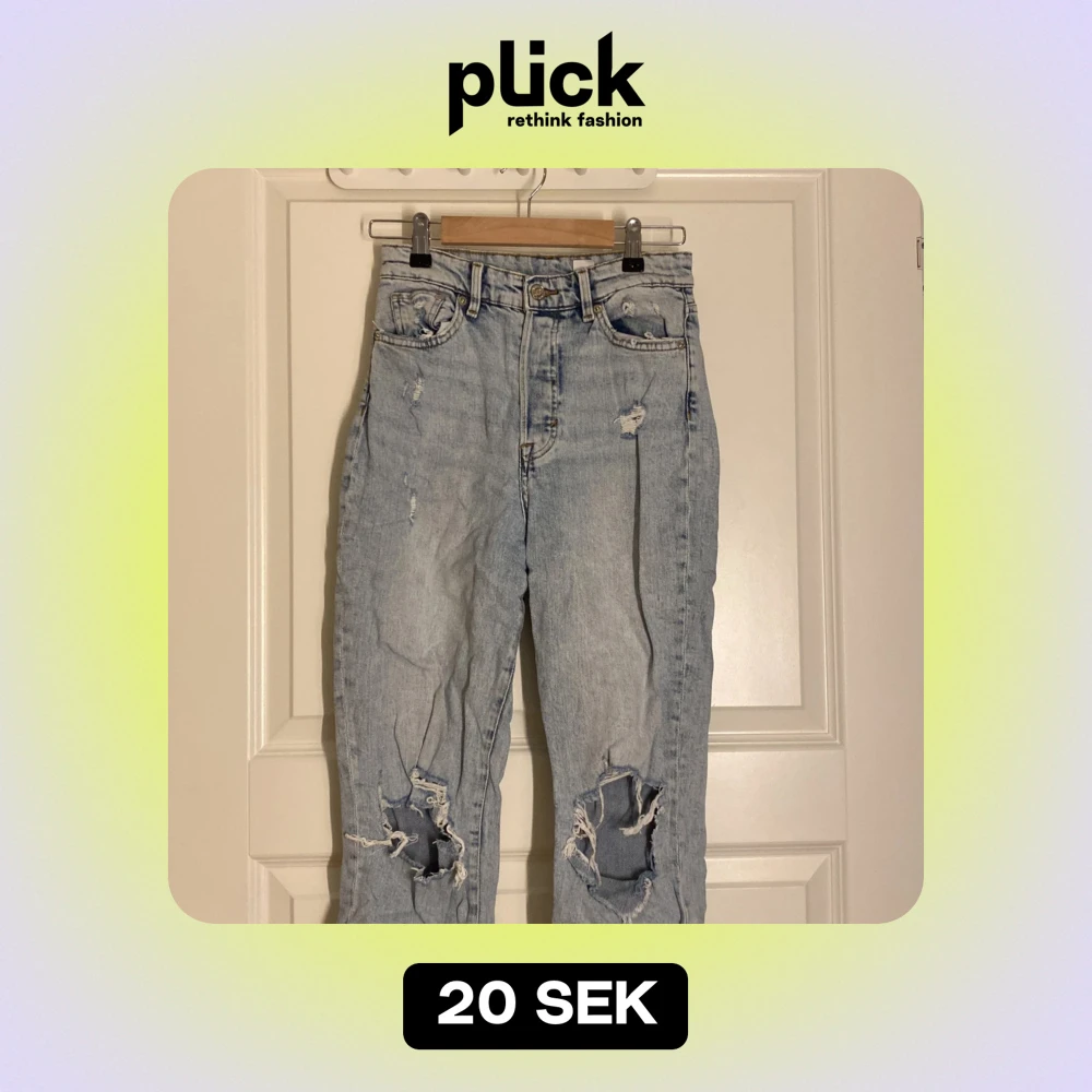 Säljer ett par ljusa jeans med hög midja och coola slitningar på knäna.