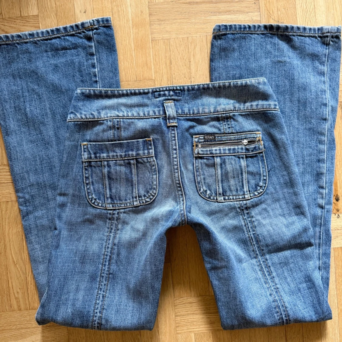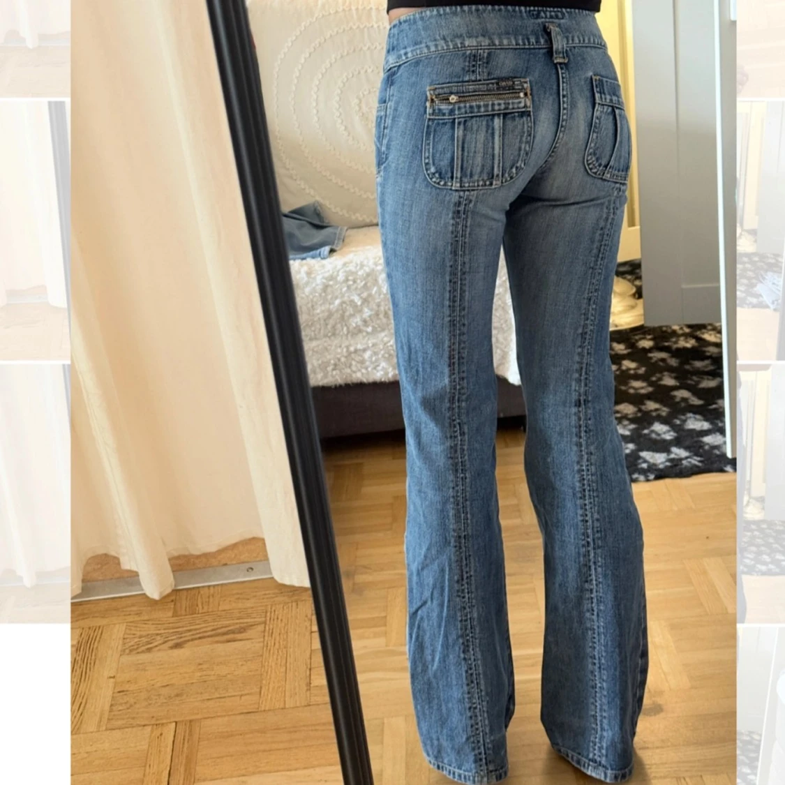 Säljer ett par blå jeans med låg midja och bootcut-modell. Jeansen har snygga detaljer som stora fickor både fram och bak samt en liten dragkedja på ena bakfickan. Klassisk tvättad denim med markerade sömmar och avslappnad passform.