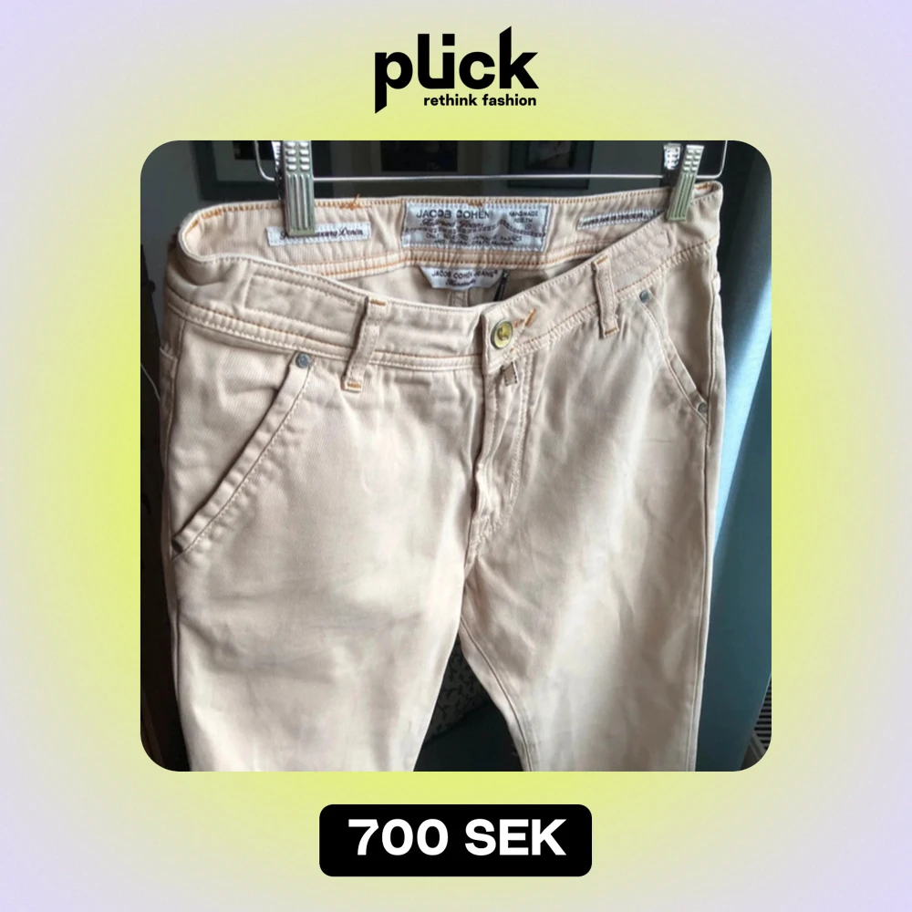 Byxor storlek 34, mycket (!) bra skick. Färgen är varm beige, 100% bomull. Längd 98, midja 44, höfter 54 cm