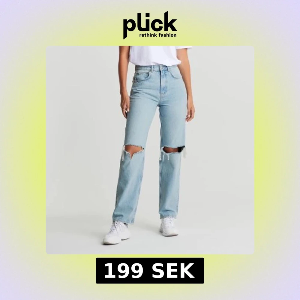 Snygga ljusa jeans med hög midja och slitningar vid knäna. Perfekta för en avslappnad stil. De har en klassisk femficksdesign och en rak passform som ger en trendig look. De är för korta för mig som är 174cm men passar någon som är max 170