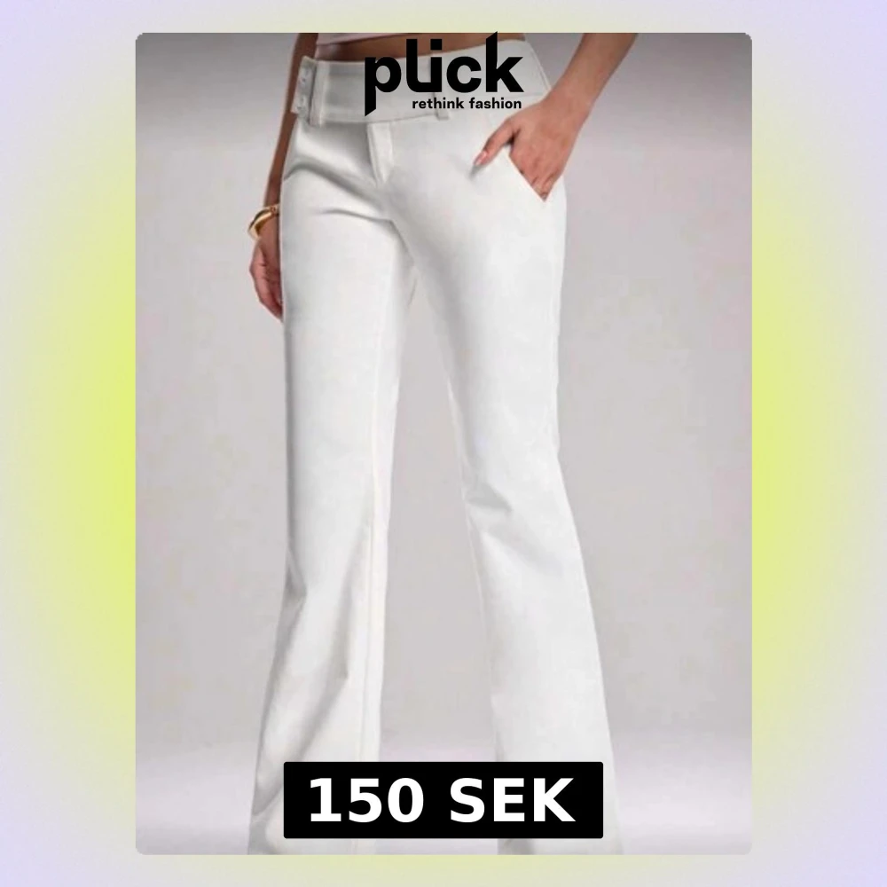 Snygga vita byxor med bootcut-snitt och hög midja. De har bred linning med dubbla knappar och fickor fram. Perfekta för dig som vill ha en clean och fräsch look. Materialet känns mjukt och har en lätt stretch för extra komfort.passar ngn som är 160 uppåt