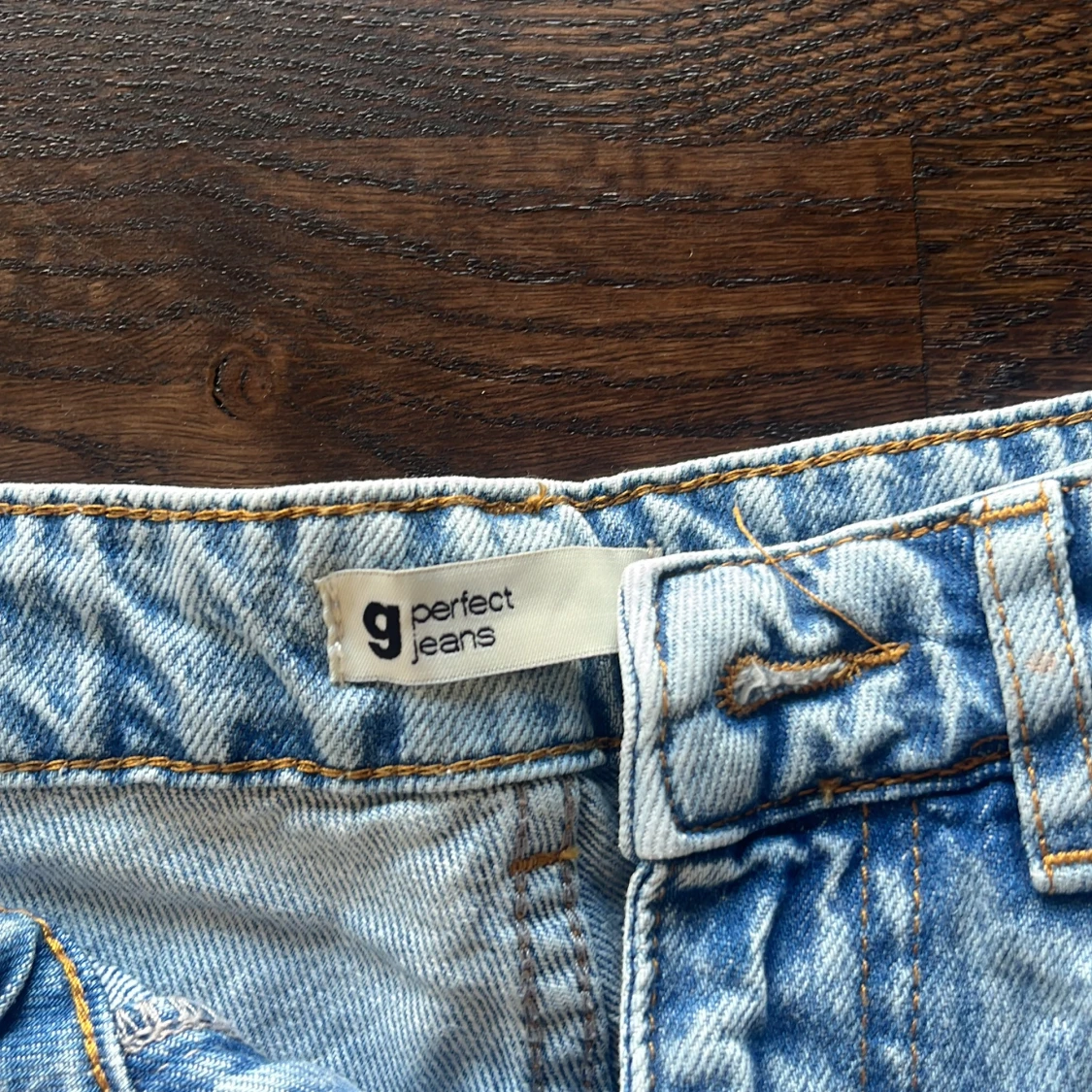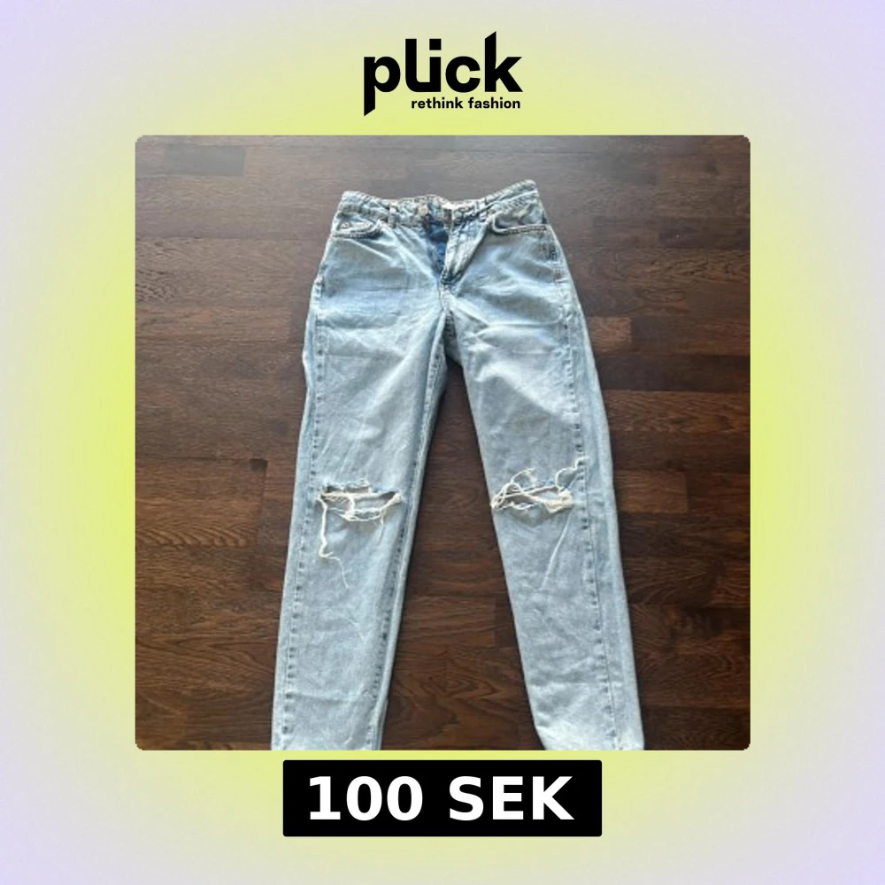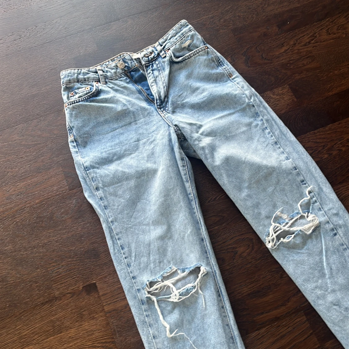 Ljusblå jeans med raka ben och slitningar över båda knäna. Klassisk femficksmodell med normal passform och hög midja. Perfekta för en avslappnad och trendig look.