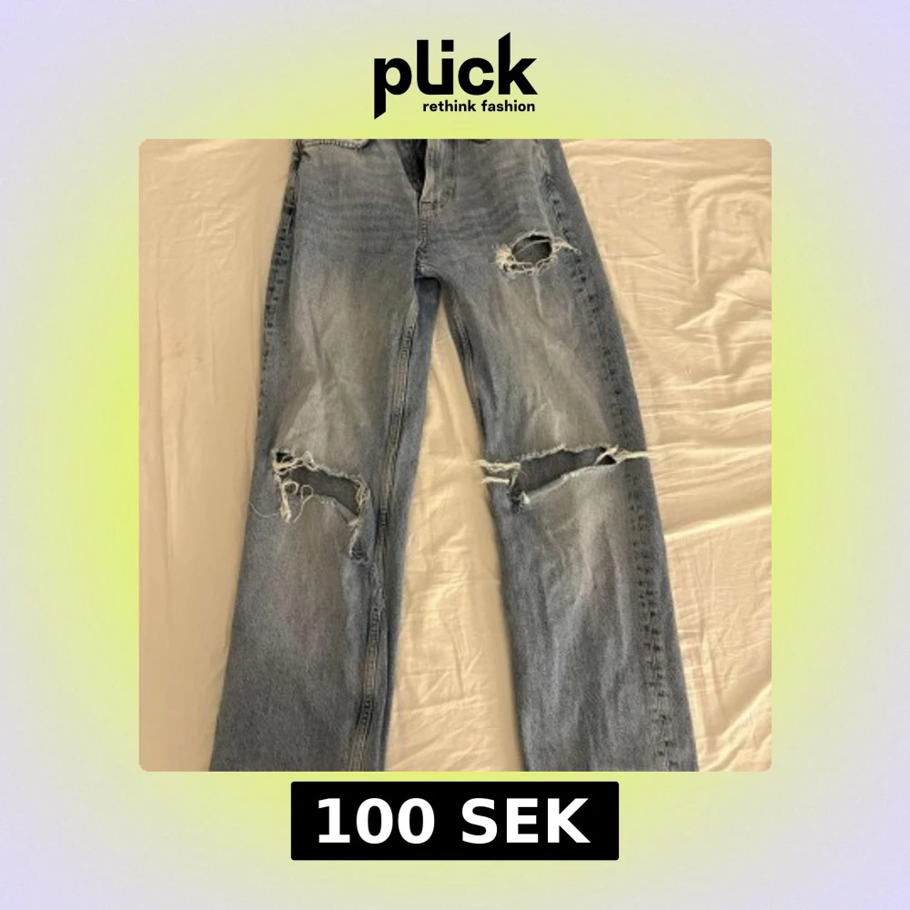 Säljer ett par ljusblå jeans med flera stora slitningar och hål på framsidan. Jeansen har raka ben och klassisk femficksdesign. Perfekta för dig som gillar en avslappnad och trendig streetstil.