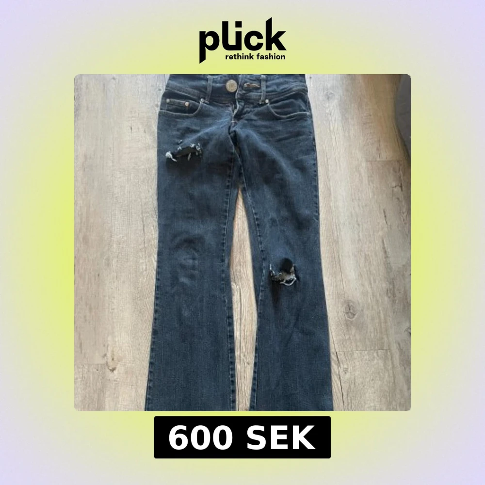 Säljer ett par mörkblå bootcut jeans, egengjorda hål på knät och högre upp vid låret. Hålen nere vid hälarna har gått sönder med tiden men inget man tänker på.