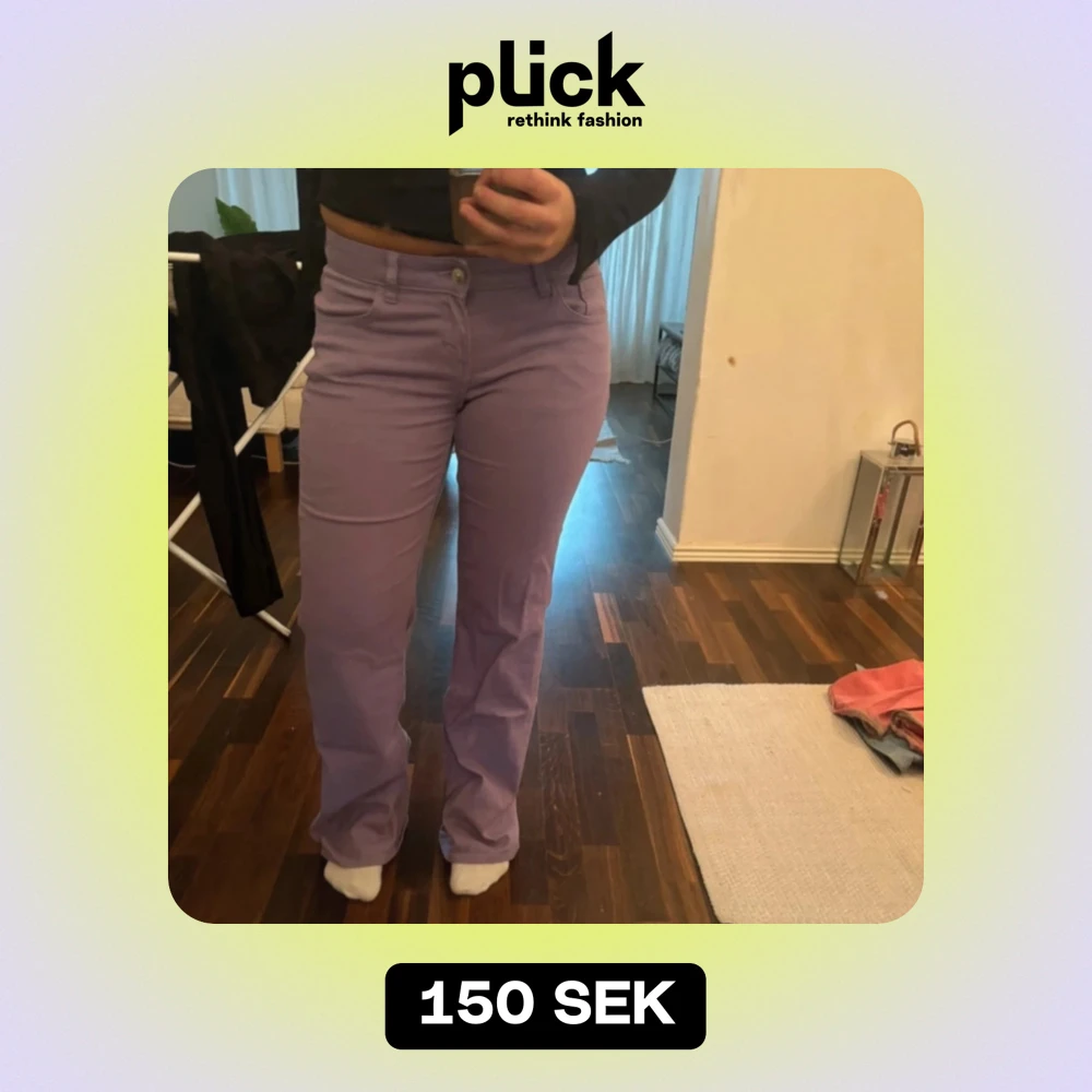 Säljer ett par snygga lila byxor med bootcut. Midjan är medelhög slutar under naveln