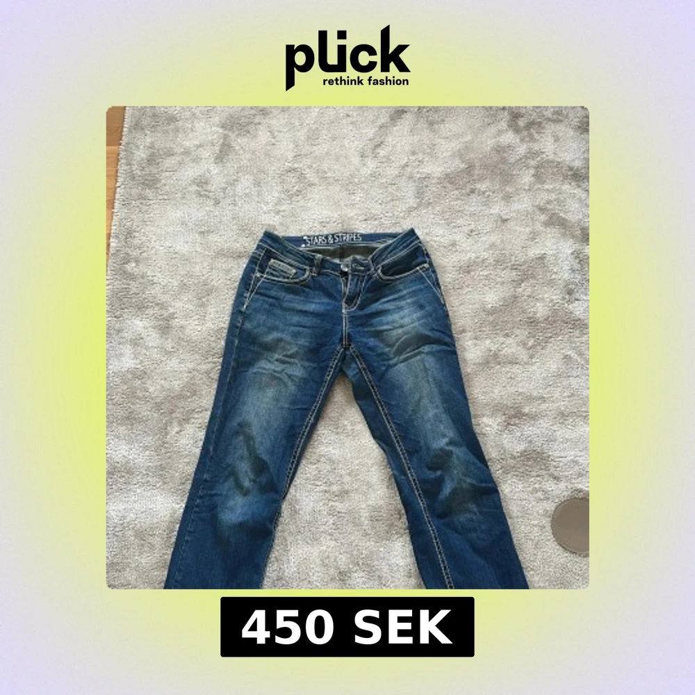 Snygga blå jeans från Stars & Stripes med coola broderade bakfickor och kontrastsömmar. Jeansen har normal passform och klassisk femficksdesign. Perfekta för dig som vill sticka ut lite extra med detaljer på fickorna. Priset kan även diskuteras.