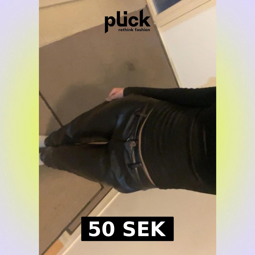Säljer ett par svarta skinnbyxor med smal passform och klassiska fickor fram. Byxorna har midja med knapp och dragkedja, samt en snygg glansig finish som ger en cool look. Perfekta för dig som vill sticka ut lite extra.