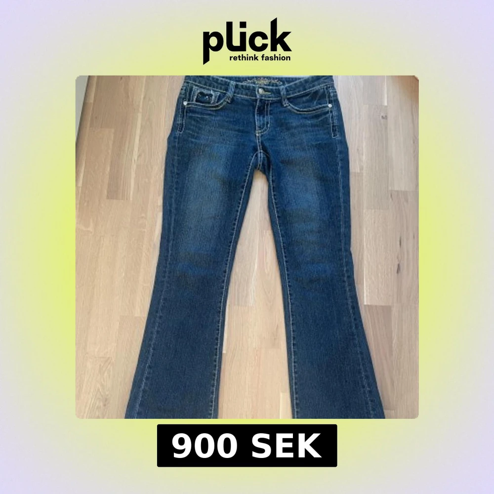 Snygga blå lågmidjade bootcut jeans med unika broderade detaljer på bakfickorna. Säljer för att den inte passar mig längre