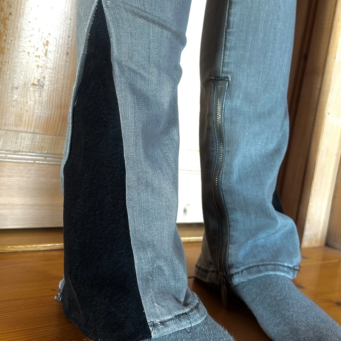 Säljer ett par grå jeans med vita spetsfickor bak och svarta paneler längs benen. Byxorna har dragkedja vid benslut och snygga knappar på fickorna. Modellen är lågmidjade med bootcut. Perfekt för dig som vill sticka ut med coola detaljer.