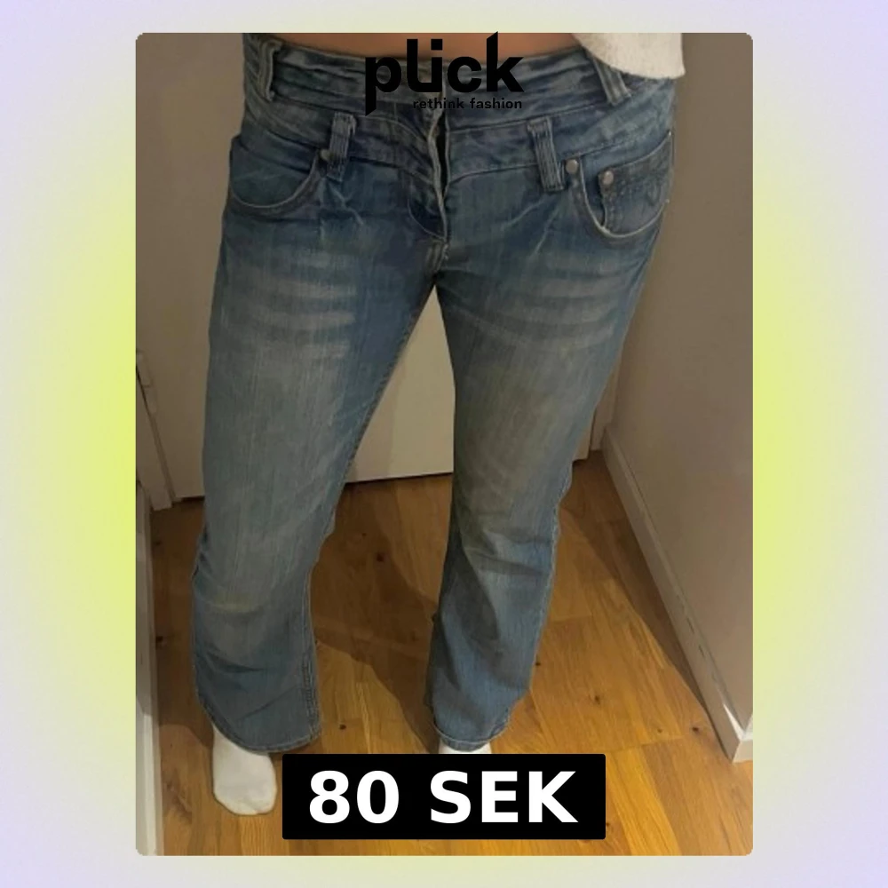 Snygga blå jeans med bootcut. Dem är i storlek 36. Vet inte märket då de är köpta från plick. Men kontakta mig mer för info!!🤍