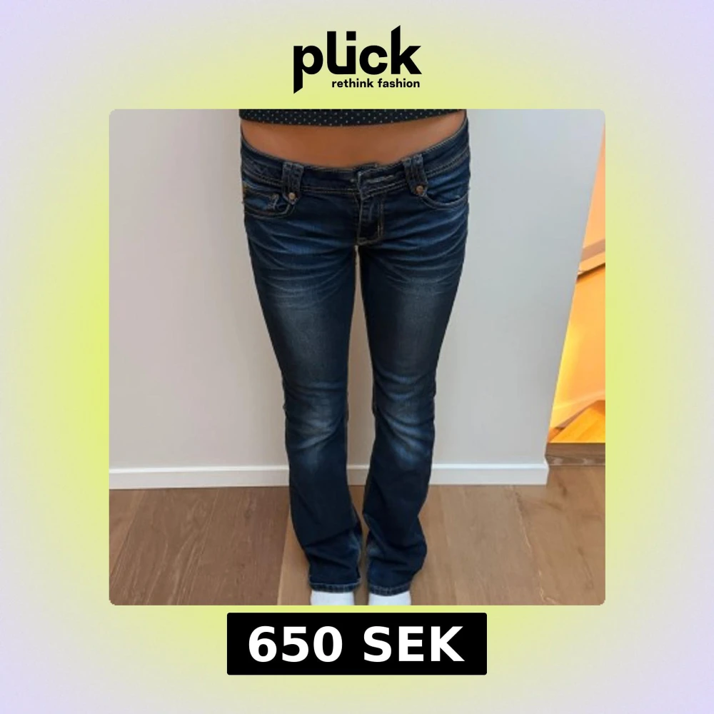Snygga blå bootcut jeans med låg midja och dekorativa sömmar på bakfickorna. Knapp saknas och lite upprivet i skrevet men inget som syns ( lätt o laga )💞💞