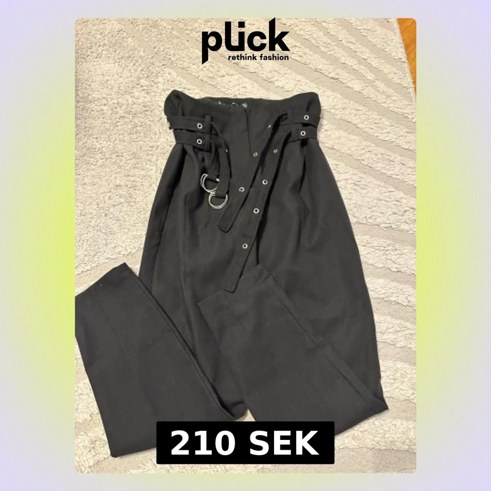 Svarta byxor med hög midja och dubbla bälten med metallringar och nitar. Byxorna har rak passform och dragkedja framtill. Materialet är mjukt och känns som bomull eller polyester. Snygga detaljer med öglor och bältesremmar för en edgy look.