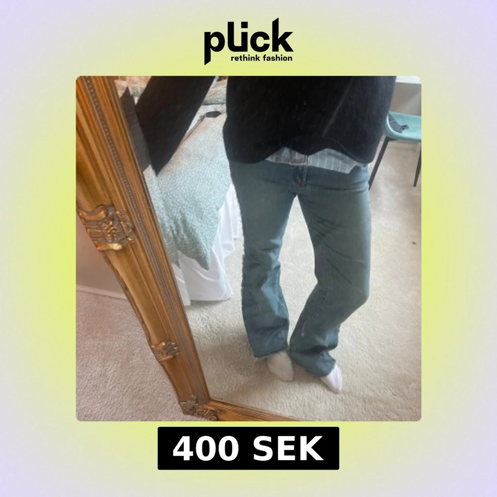 Säljer ett par blå jeans med bootcut passform och råa, slitna kanter längs benen. Jeansen har klassisk femficksdesign och är tillverkade i ett robust denimtyg. Perfekta för dig som gillar en avslappnad och trendig stil.