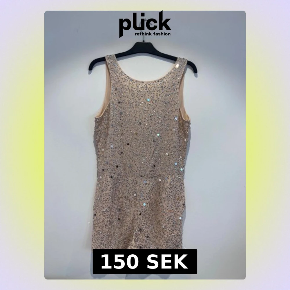 Snygg beige byxdress med massor av glittrande paljetter och stenar över hela plagget. Modellen är ärmlös med rund hals framtill och djup v-ringning bak. Materialet känns mjukt och har en lyxig känsla, perfekt för att sticka ut. Dragkedja i ryggen för enkel påklädning.