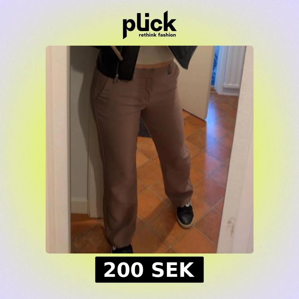 Snygga beiga kostymbyxor och normal passform, mid waist. Perfekta för en clean och stilren look, passar till sneakers eller boots. Använda 2 gånger.