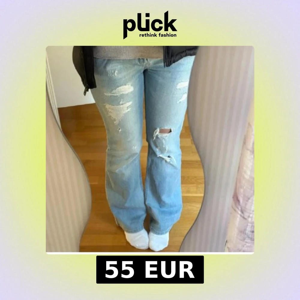Lågmidjade bootcut jeans med slitningar  - Säljer ett par blå jeans med blekt tvätt och slitningar på framsidan. Perfekt för dig med unik och trenig stil. Storleken står inte nånstans men jag skulle säga att de passar dig som har xs-m. Skriv för fler frågor eller bilder