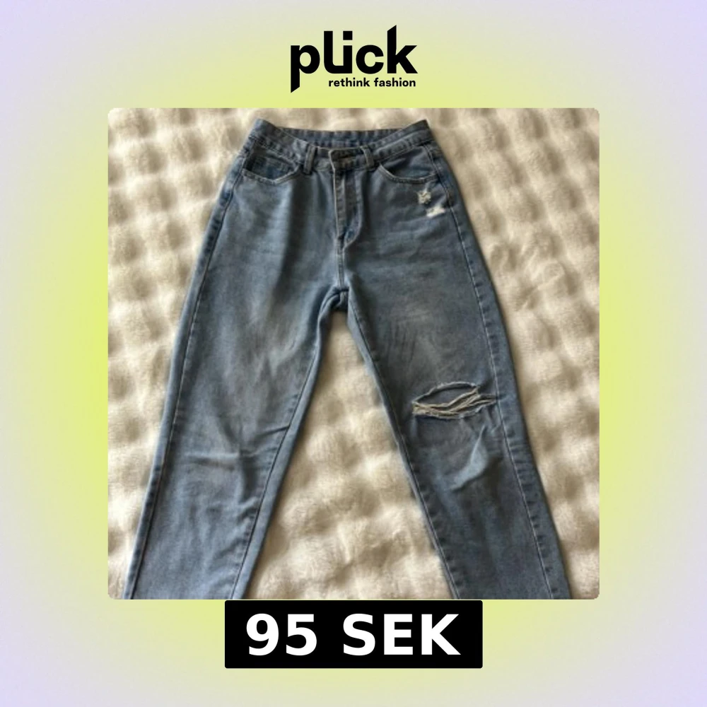 Säljer ett par ljusblå jeans med hög midja och raka ben. Jeansen har slitna detaljer vid fickan och ett större hål på ena knät för en cool, avslappnad look. Klassisk femficksmodell och bälteshällor. Perfekta till sneakers eller boots. Lös passform. Storlek M