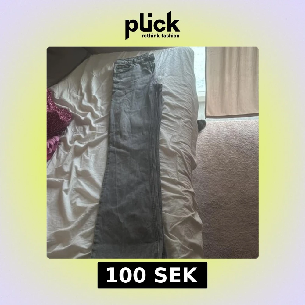 Ljusblå bootcut jeans - Säljer ett par ljusblå jeans med bootcut passform och låg midja. Jeansen har en unik look. Den ”hängande” delen av dragkedjan lossnat som ni kan se på den sista bilden annars är det inget fel på dom! Midjemått 37cm, innerbenslängd 80cm.