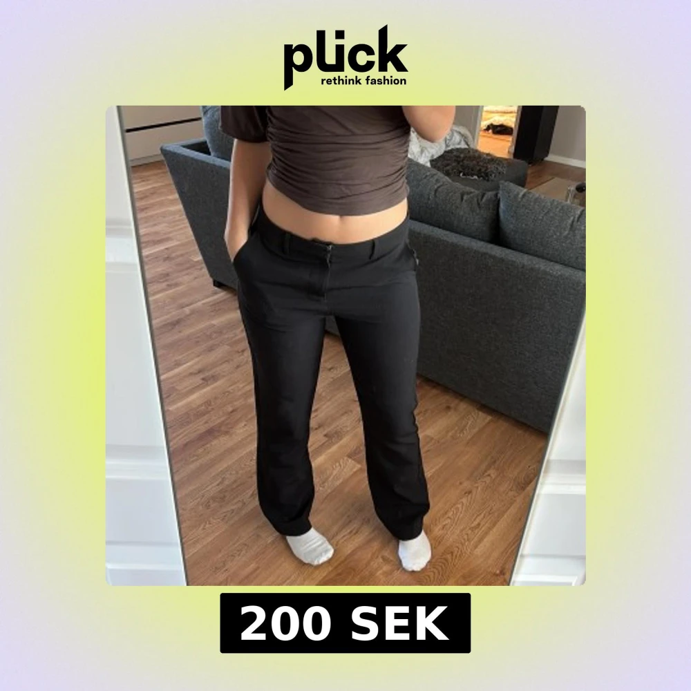 Svarta kostymbyxor med klassisk rak passform och midja med hällor för bälte. Byxorna är högmidjade men går att vika ner om man vill det lika fint det också. Byxorna har diskreta fickor fram och bak, stängs med dragkedja och knapp. Perfekta för en clean och stilren look. Materialet känns mjukt och följsamt.