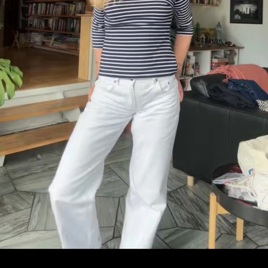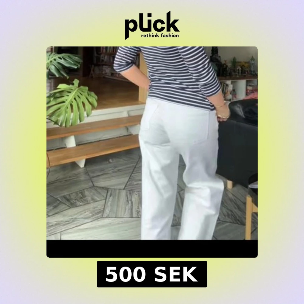 Säljer ett par vita jeans med raka ben och medelhög midja. Byxorna har klassiska fem fickor och bälteshällor. Snygg och enkel modell som passar till allt, i ett stadigt jeanstyg.