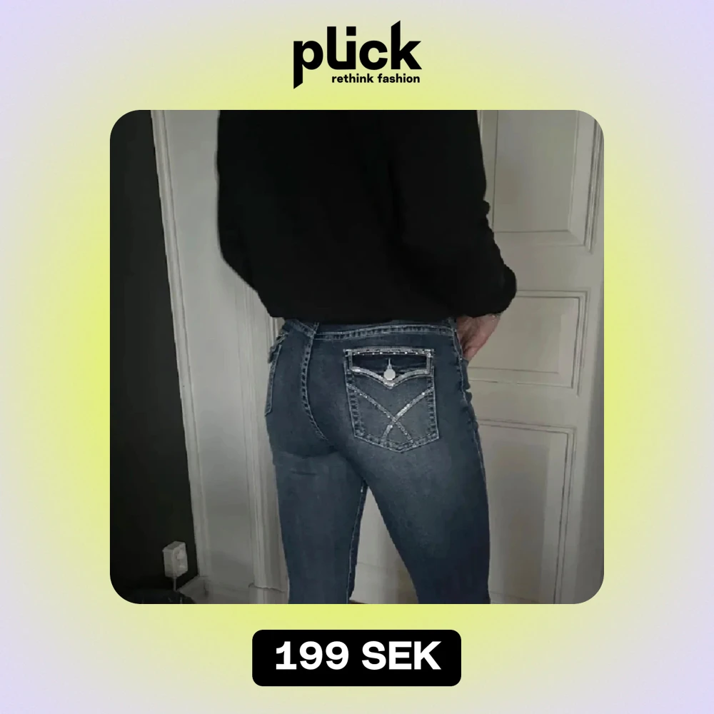 Snygga blå jeans med unika detaljer på bakfickorna. Perfekta för en stilren look med en touch av karaktär. Passar bra till både vardag och mer uppklädda tillfällen.