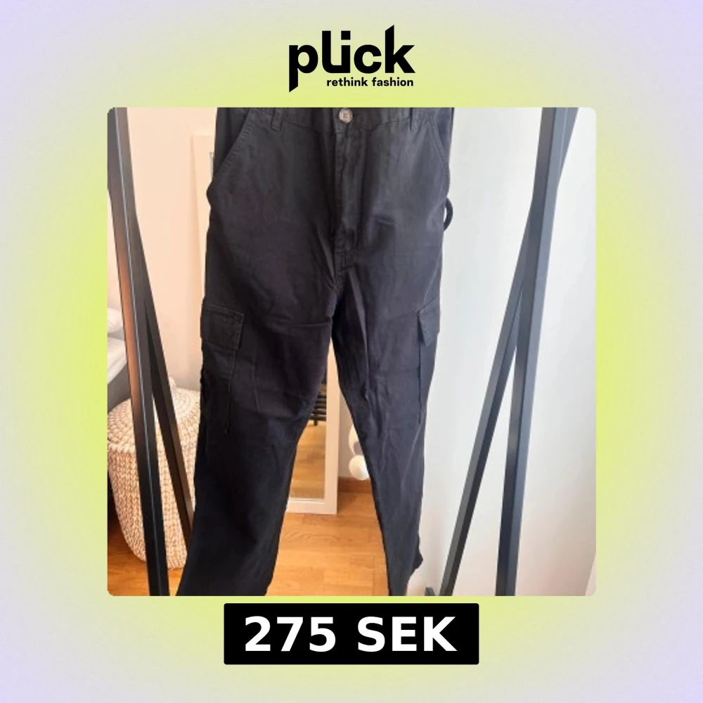 Svarta byxor med fickor på sidorna och bakfickor. Byxorna har en knappstängning fram. Endast provad.