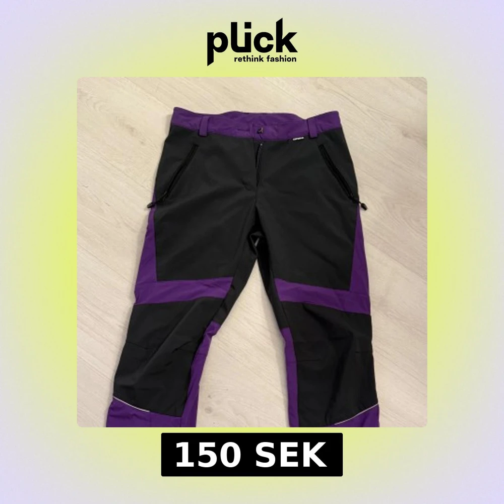 Snygga byxor i svart och lila med praktiska dragkedjor på fickorna. Perfekta för utomhusaktiviteter med sin tåliga design och bekväma passform.