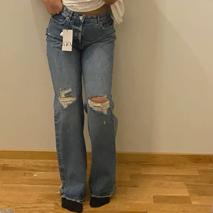 Juliana studios Stockholm City Jeans - Helt nya jeans från Juliana Studios! Det är deras Stockholm City Jeans. Köpte de för totalt ~1300kr. Helt slutsålda! Säljer då de inte passade. Prislappen är kvar. Storlek XS. Bilderna är lånade från hemsidan och deras TikTok, men de två sista bilderna är mina. ❤️    Ett par ljusblå jeans med bootcut passform och låg midja. Jeansen har snygga slitningar och hål på benen för en cool och avslappnad vibe. Tillverkade i klassiskt denim-material och har fem fickor samt knapp och dragkedja framtill