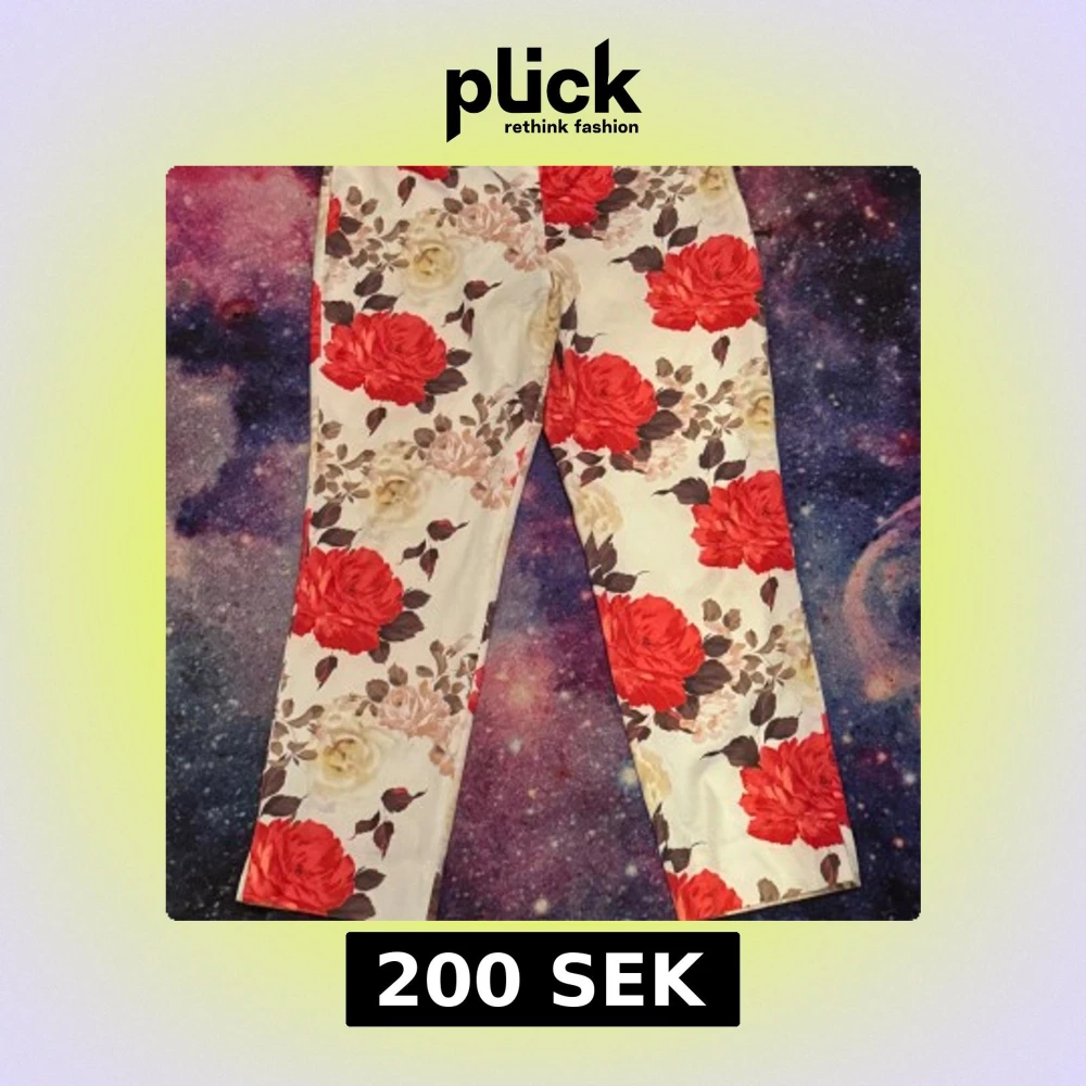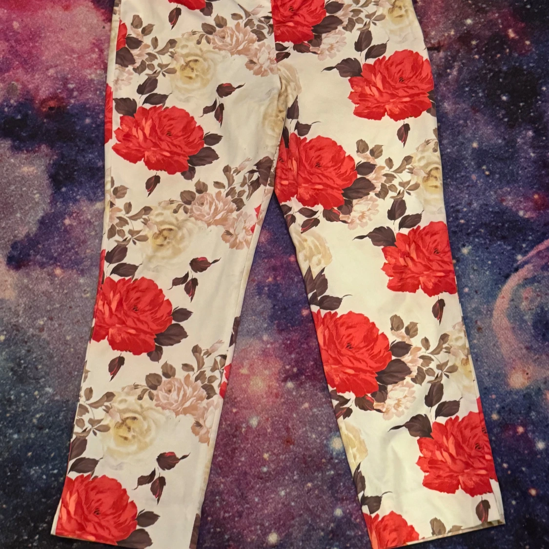 Snygga byxor med ett färgglatt blommönster i rött och beige på en vit bakgrund.