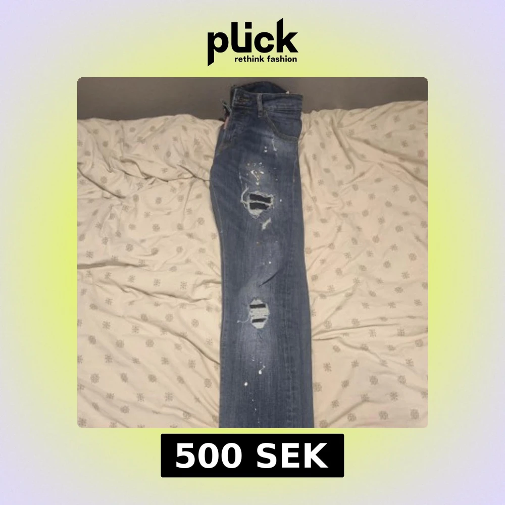 Säljer ett par blå jeans från Dsquared2 med slitna detaljer och färgstänk. Jeansen har en normal passform och är perfekta för en avslappnad stil. Fick de så vet ej ifall de är äkta!