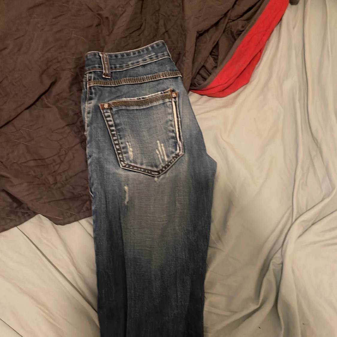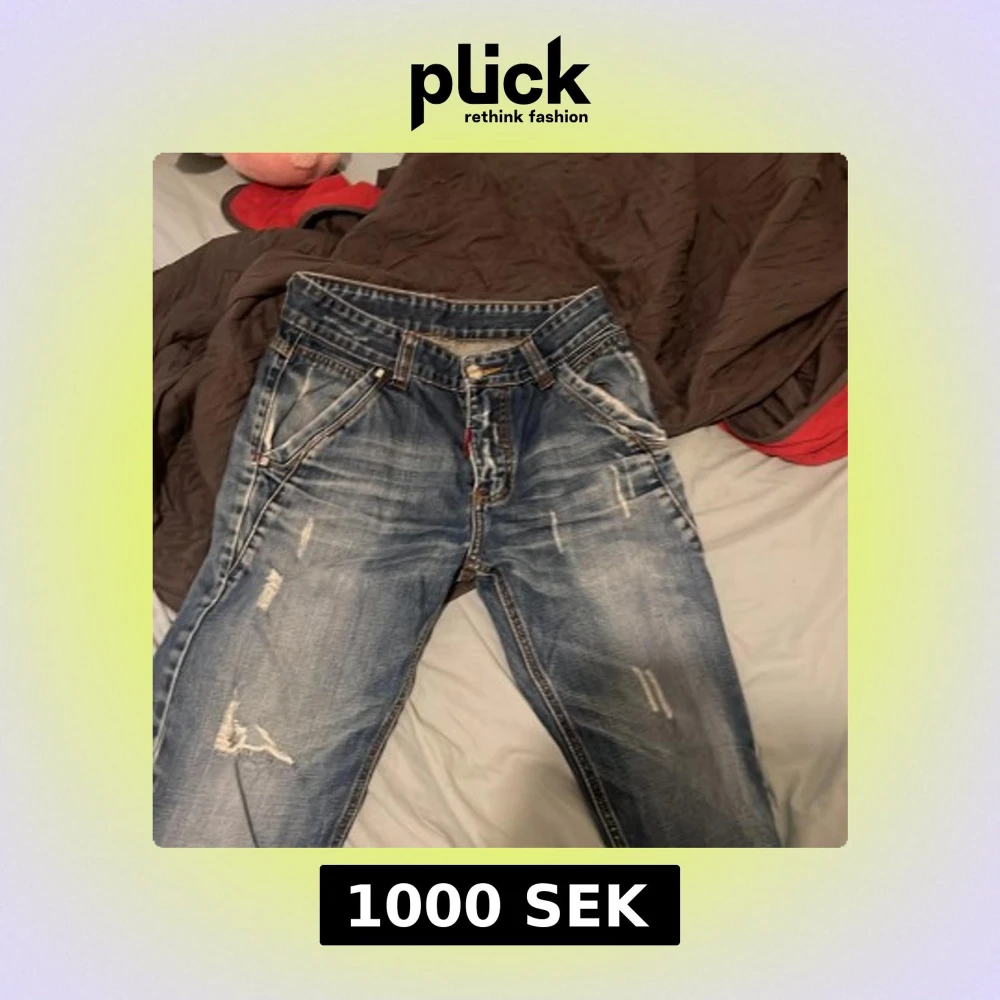 Säljer ett par blå jeans från Dsquared med coola slitningar och tvättade detaljer. Klassisk femficksmodell med Dsquared-lapp bak i midjan. Jeansen har raka ben och kontrastsömmar, perfekt för dig som gillar streetstyle och vill sticka ut.