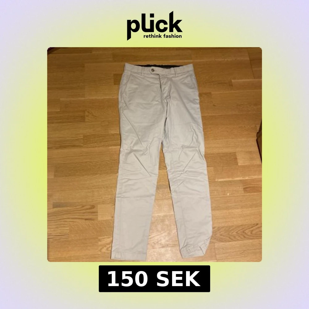 Snygga beige chinos från Bläck. De har en klassisk design med knapp och dragkedja framtill. Perfekta för en stilren look. Storlek 46, knappt använda