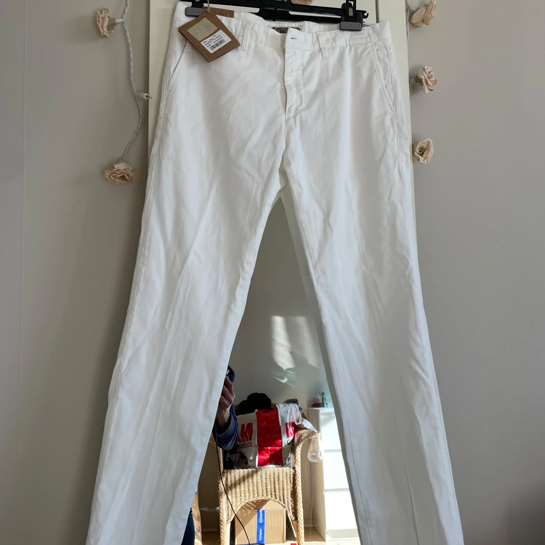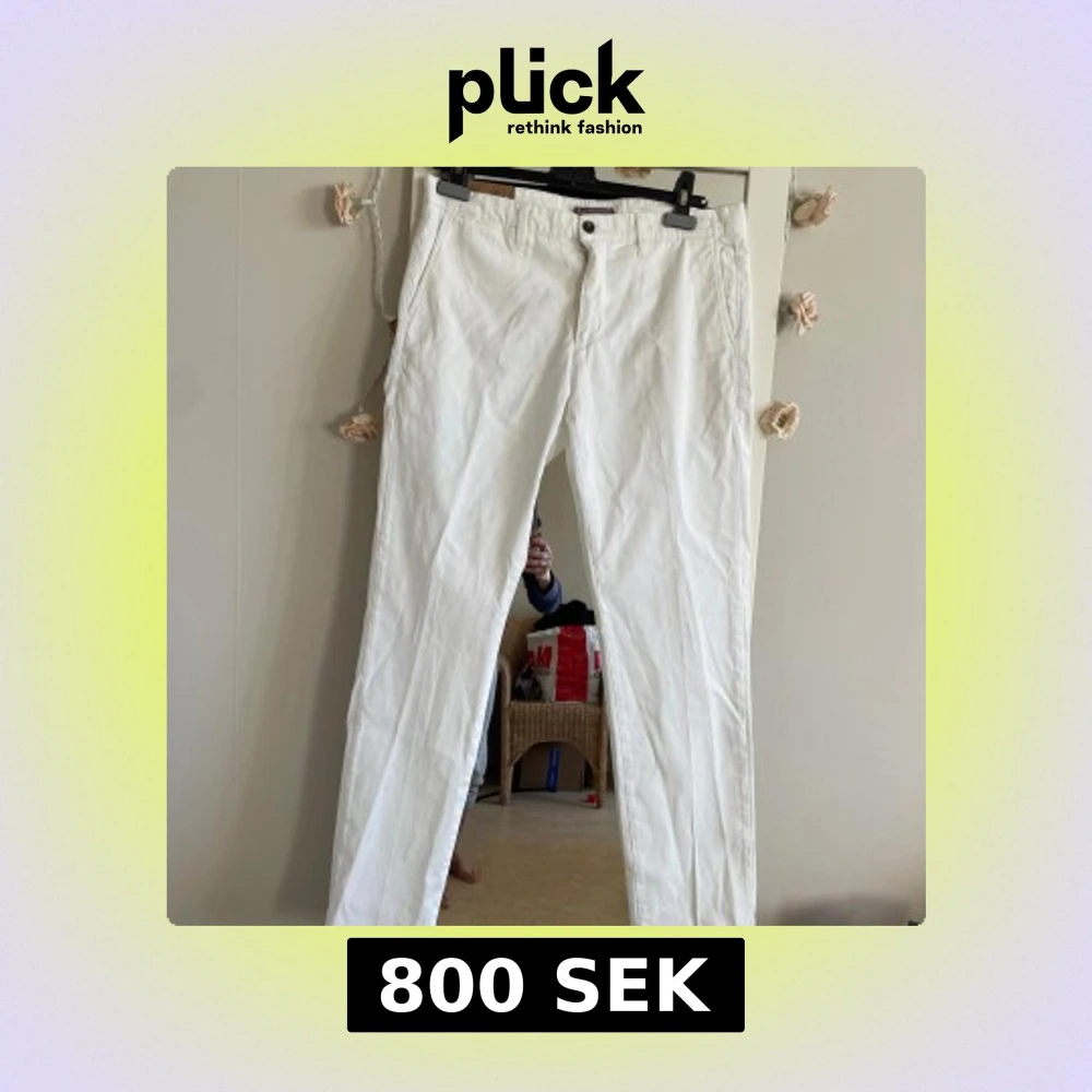 Snygga vita jeans chinos byxor från Four.ten med en klassisk design. Storlek 50/18 . Måttet på midjan är ca 43cm . På insidan på byxa är ca83cm . Helt nya oanvända. Nypris är 1600 kr nu 800kr