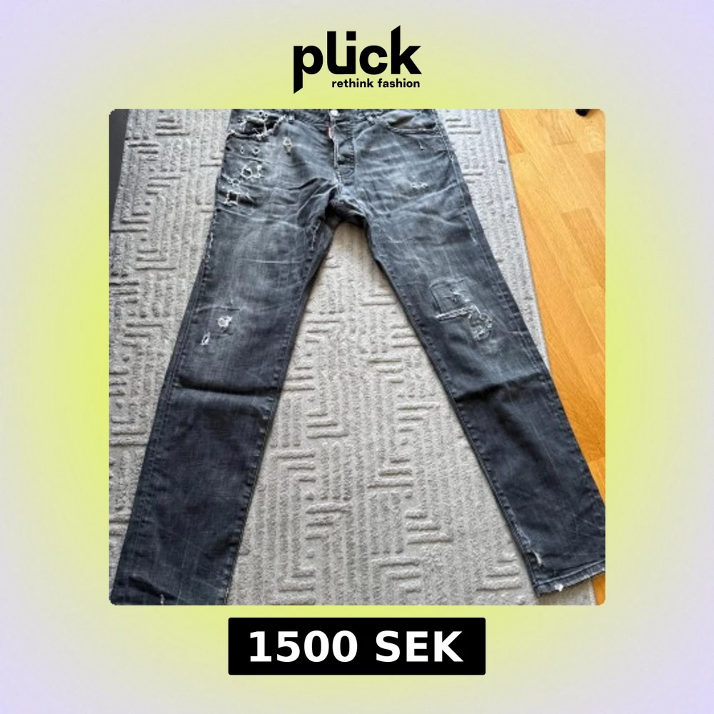 Säljer ett par grå jeans från Dsquared2 med coola slitningar och hål för en edgy look. Jeansen har raka ben, klassisk femficksdesign och tydliga slitna detaljer både fram och bak. Materialet är jeans och passformen är normal. Självklart äkta se kvitto