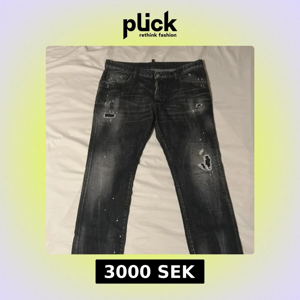 Snygga (äkta) svarta jeans från Dsquared2 med slitna detaljer och en cool, distressed look. Perfekta för en avslappnad stil. De har en klassisk femficksdesign och knappgylf. Helt nya har inte använt så mycket då de är små. Säljer inte för mindre än 3000! Nypris 6,200 mitt pris 3,000