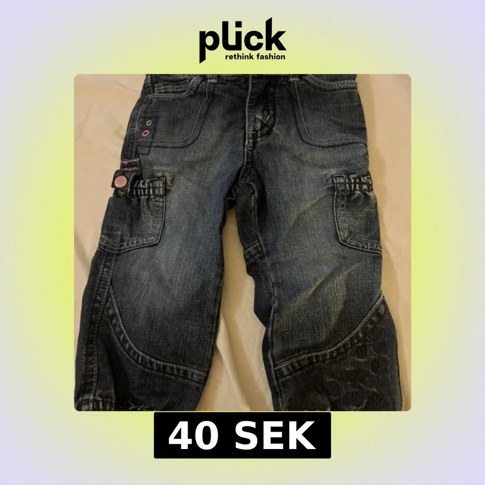 Säljer ett par mörkblå cargopants från Detroit i jeansmaterial. Byxorna har flera fickor, rosa dekorativa knappar och sömmar samt broderade detaljer på benen. Perfekta för dig som gillar en cool och avslappnad stil.