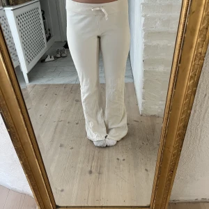 Vita lågmidjade mjukisbyxor  - Säljer ett par vita mjukisbyxor med väldigt låg midja. De har en relaxed fit och är perfekta för chill dagar hemma eller när du vill vara bekväm. Byxorna är i mjukt material och har en enkel, clean look. De är tyvärr för korta på mig annars är de helt perfekta! De är utsvänga ner till ❣️