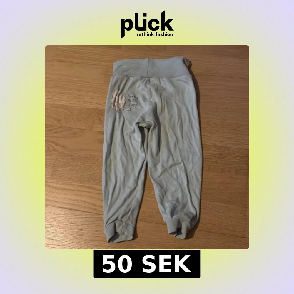 Supermjuka ljusgrå mjukisbyxor med bred midja och söt broderad detalj med texten 'Happy little lamb' på ena höften. Perfekta för chill dagar eller som mysplagg hemma.