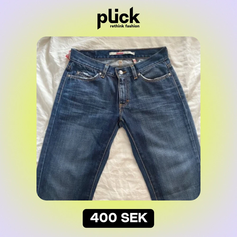 Lågmidjade bootcut jeans som köptes på Plick men passade tyvärr inte. (Sista bilden är lånad)