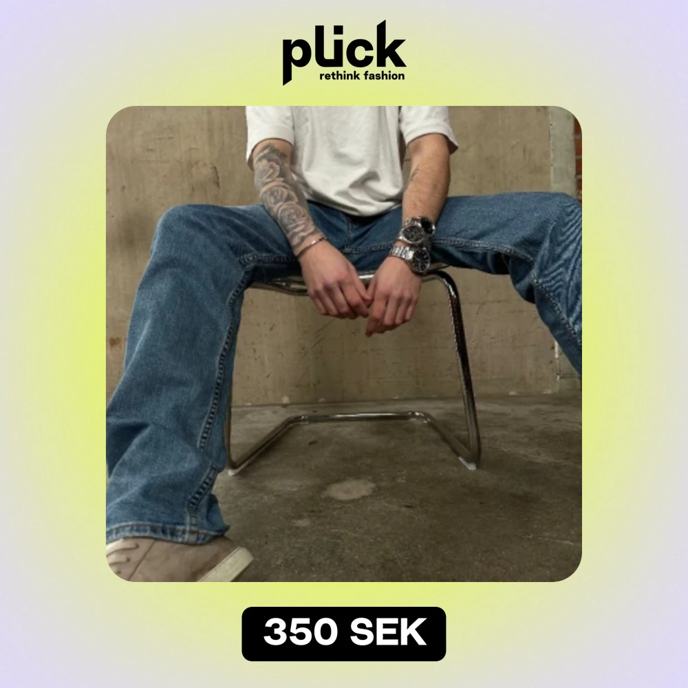 Blå jeans som är raka i modellen i storlek 34/34. Köp via Instagram @avint.uf 💕