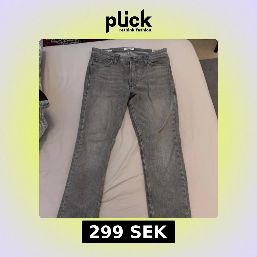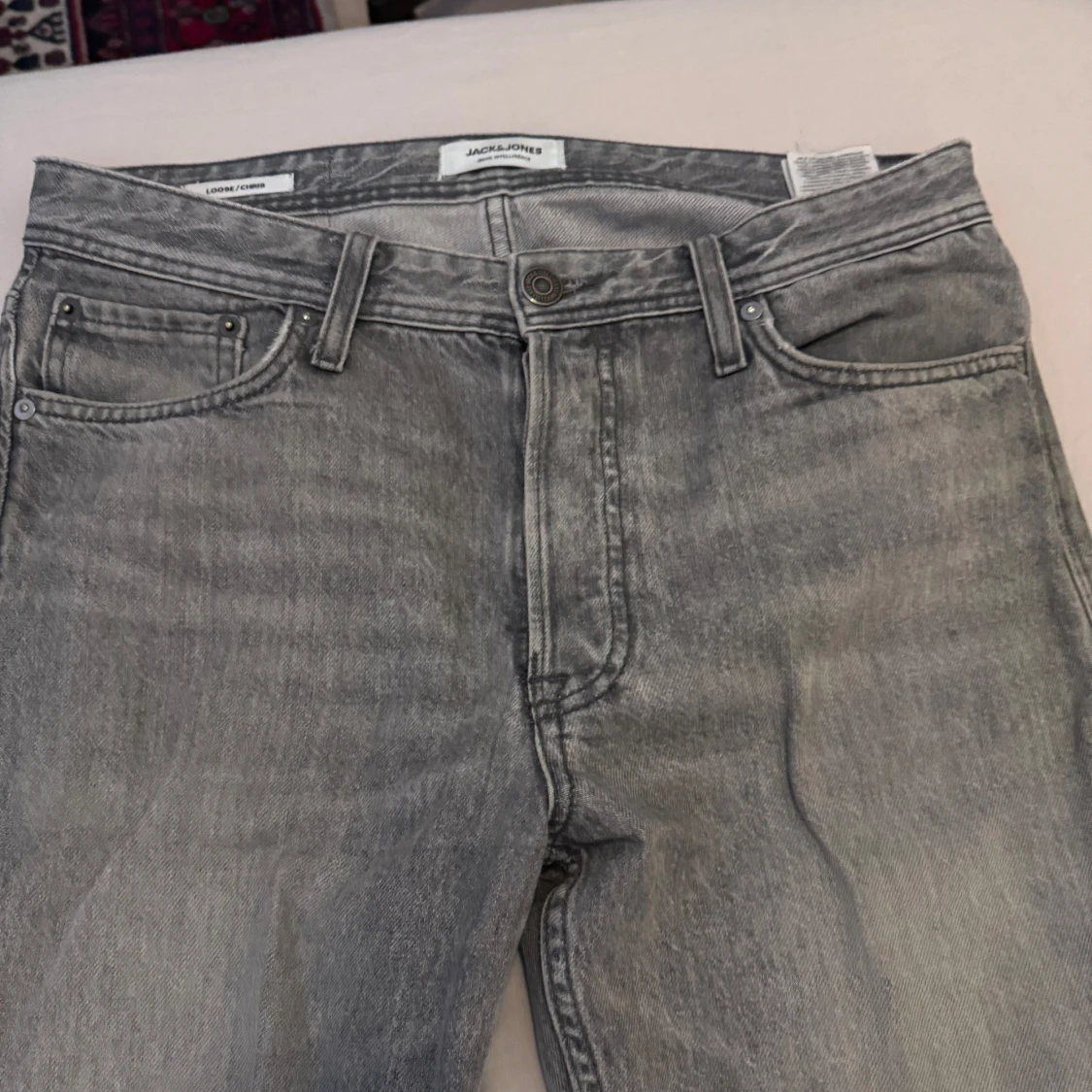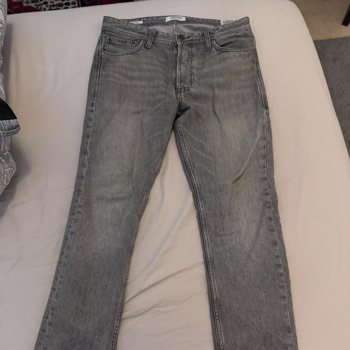 Säljer ett par grå jeansbyxor från Jack & Jones med klassisk femficksdesign och raka ben. Byxorna har normal passform och stängs med dragkedja och knapp. Perfekta till vardags för en stilren look. Storlek L30/W28