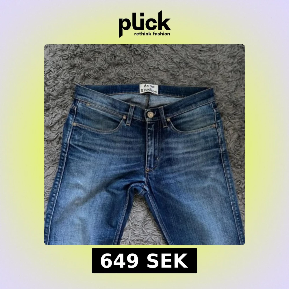 Snygga blå jeans från Acne Studios. Dom har en lätt tvättad look som ger en cool vintagekänsla. Samt väldigt unika. Användt ett fåtal gånger och bra sick strl 28/32 men passar även 29/32!