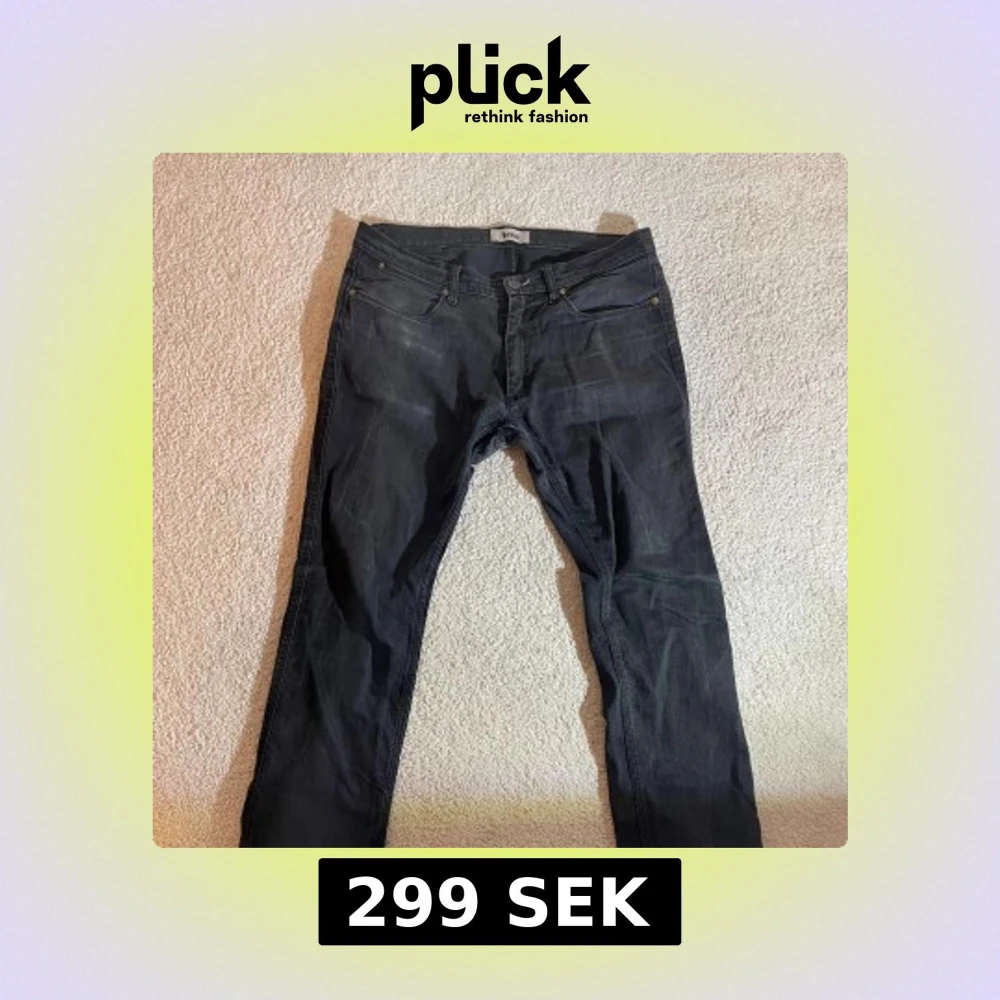 Säljer ett par svarta jeans från Acne med klassisk femficksdesign och smal passform. Jeansen har snygga detaljer som nitar vid fickorna och Acne-logga på knappen. Jeansen är lagade vid skrevet