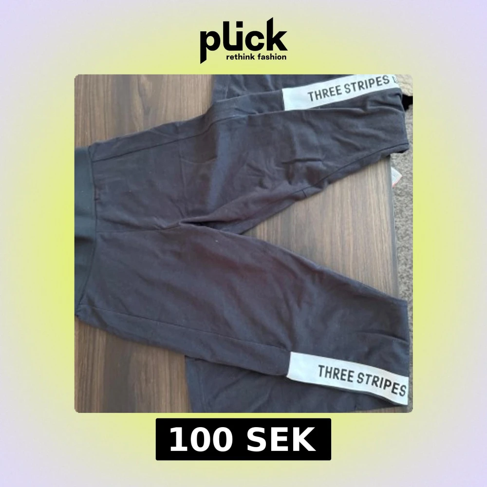 Snygga svarta leggings från Adidas med texten 'THREE STRIPES' längs benen. Perfekta för träning eller en avslappnad dag. Tillverkade i ett mjukt och stretchigt material för bästa komfort.