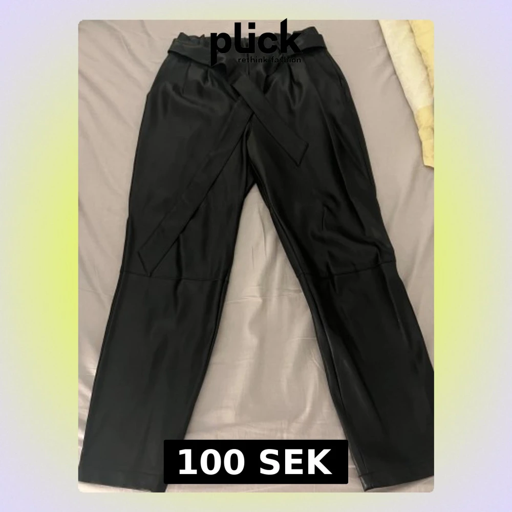 Säljer ett par svarta byxor i fuskskinn från Amisu, storlek 40. Byxorna har hög midja, avsmalnande ben och ett brett bälte i midjan som knyts framtill. Dragkedja till gylf. Snyggt glansigt material och stilren look som passar till många outfits.
