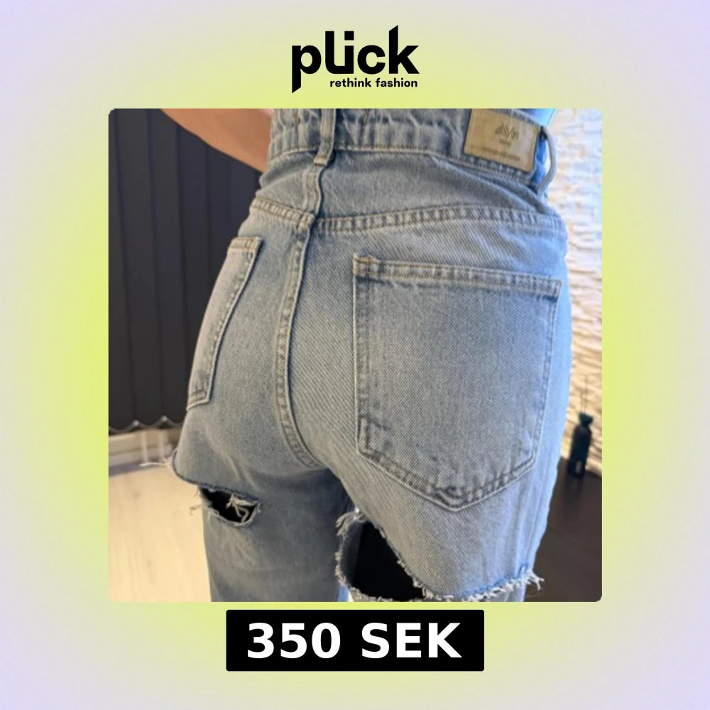 Snygga blå högmidjade jeans med en avslappnad passform. De har slitna detaljer vid knäna och en klassisk femficksdesign. Perfekta för en trendig och avslappnad stil. Jättefina och moderna byxor. Jag rekommenderar dem varmt. Passar perfekt i m/l storlek.🌸👌