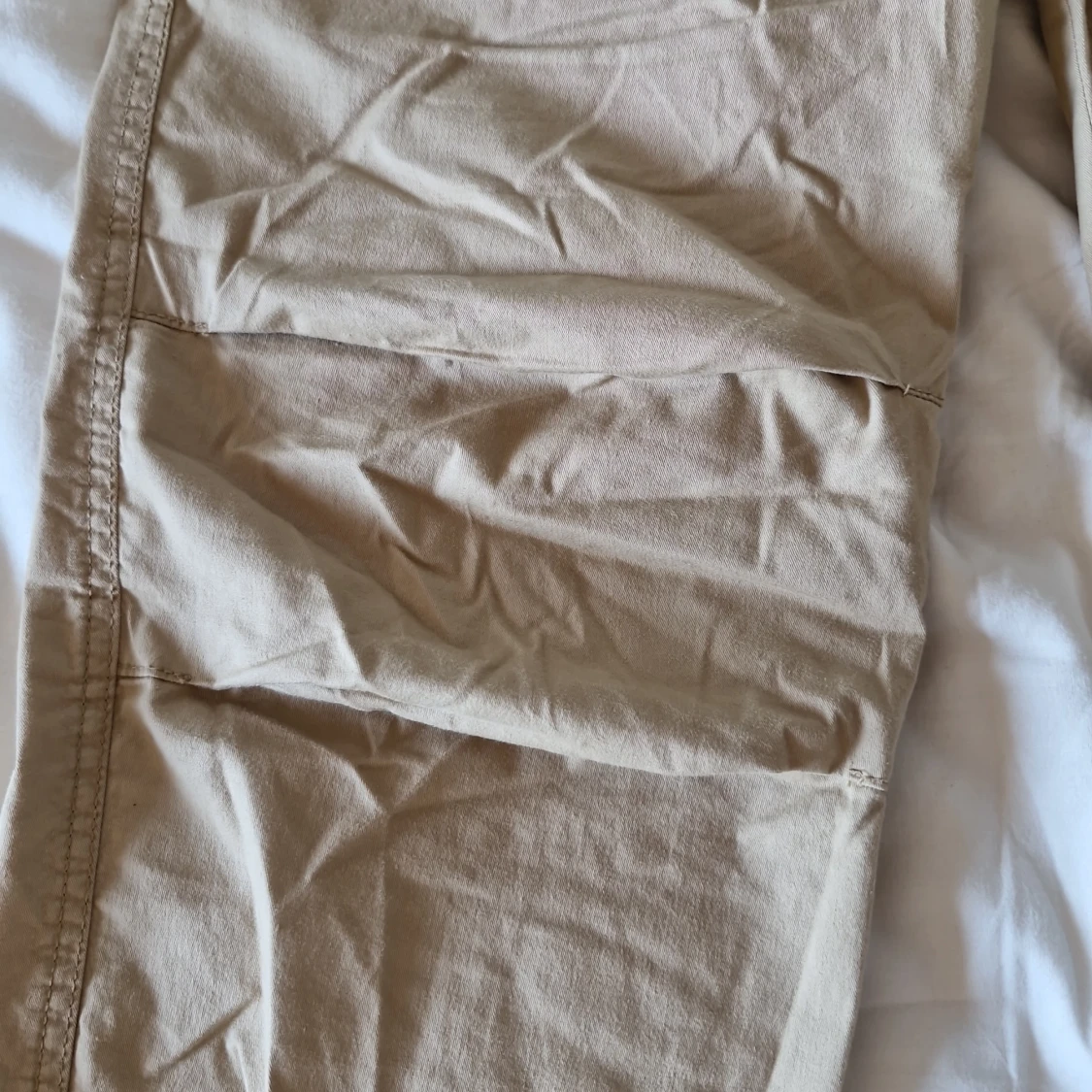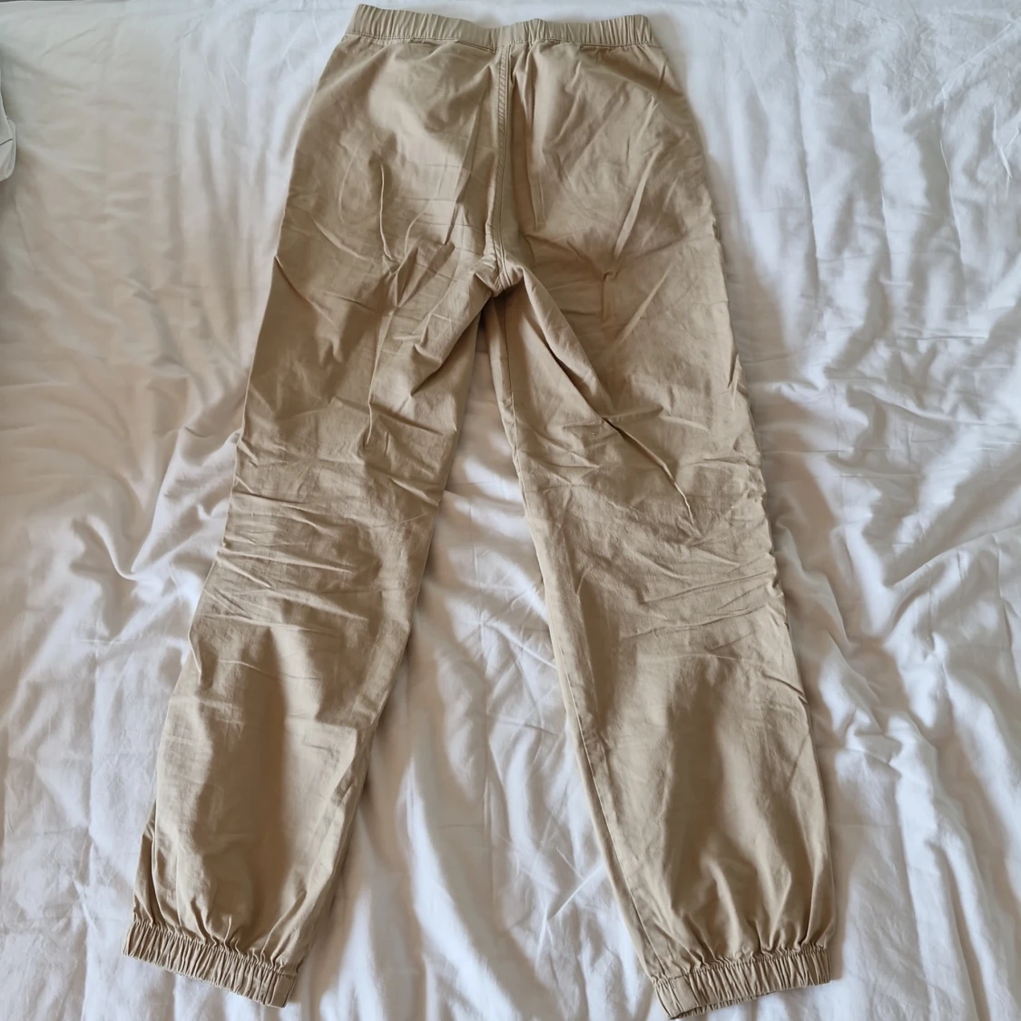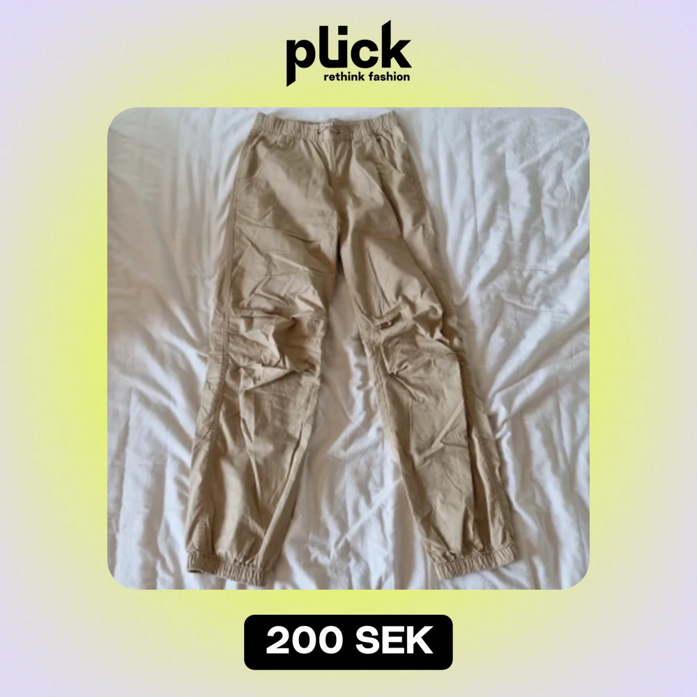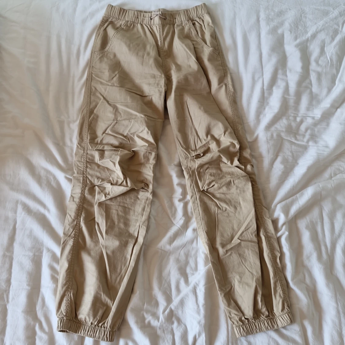 Säljer ett par bekväma beige cargobyxor från Lindex. De har en elastisk midja med snörning för extra komfort och justerbar passform. Byxorna är perfekta för vardagsbruk och har en avslappnad stil med resår vid bensluten.