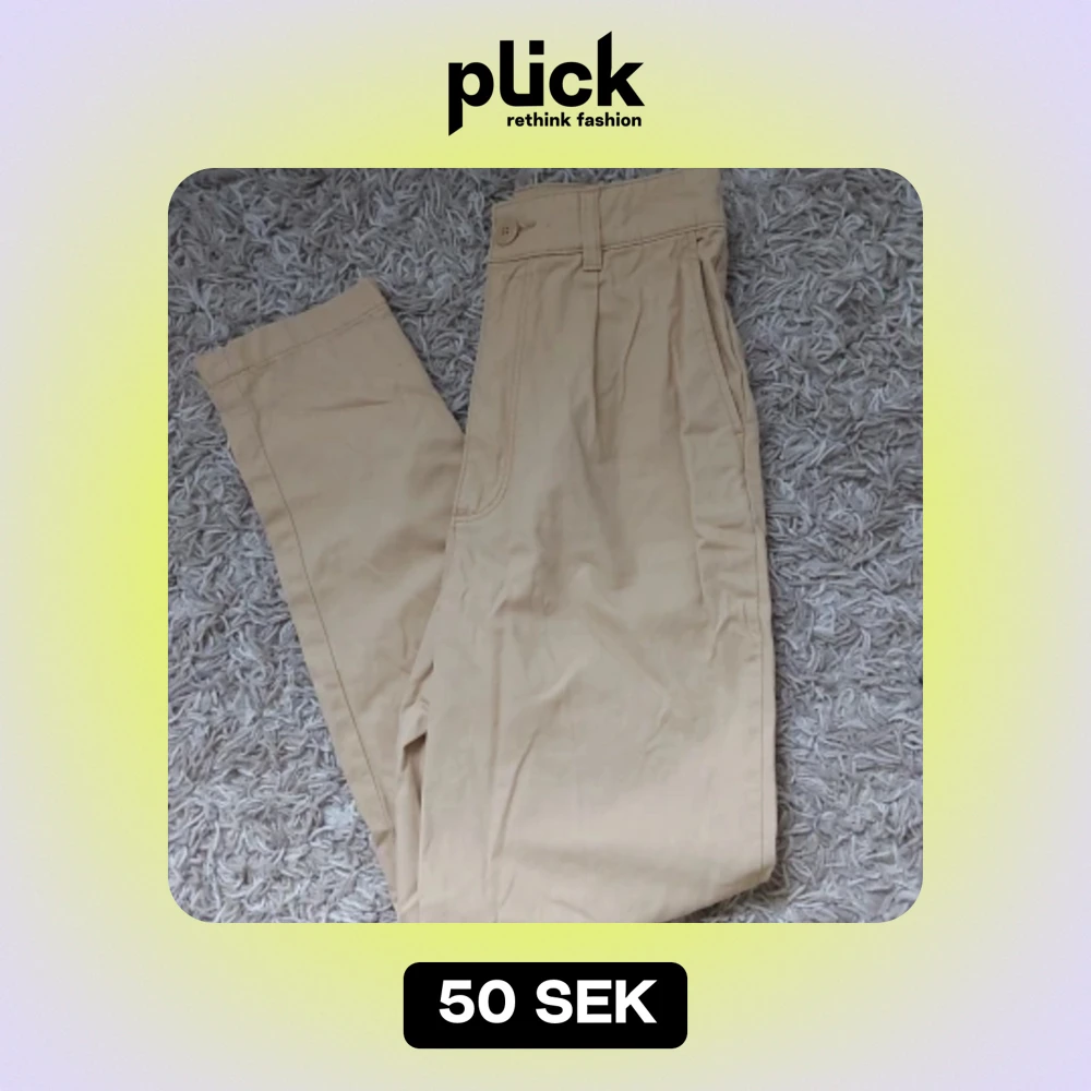 Säljer ett par snygga beige chinos. De är högmidjade från HM, DIVIDED i stl.34. Byxorna har en knapp och dragkedja framtill samt bälteshällor med en bakficka.