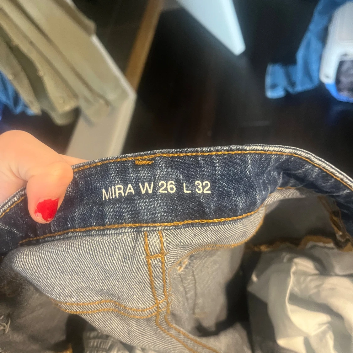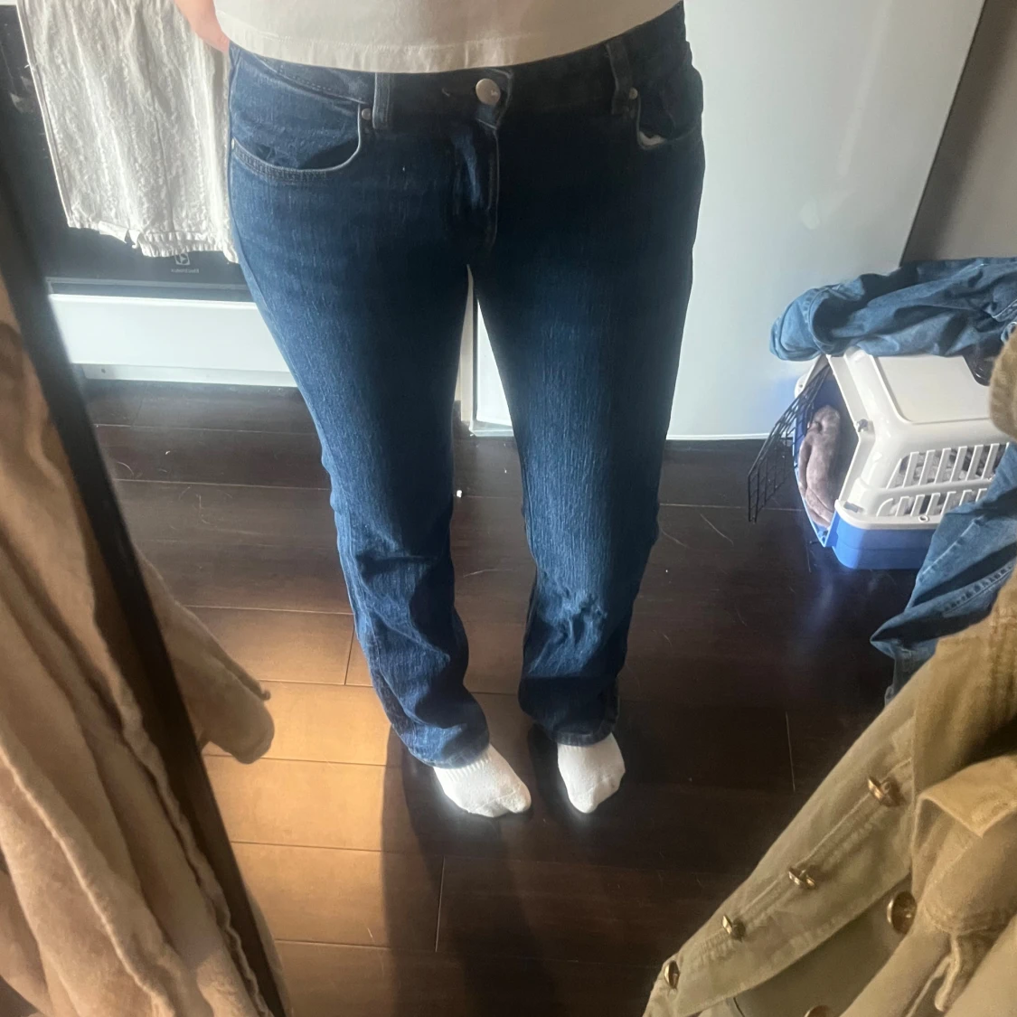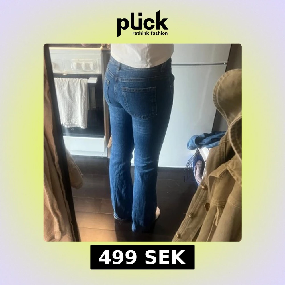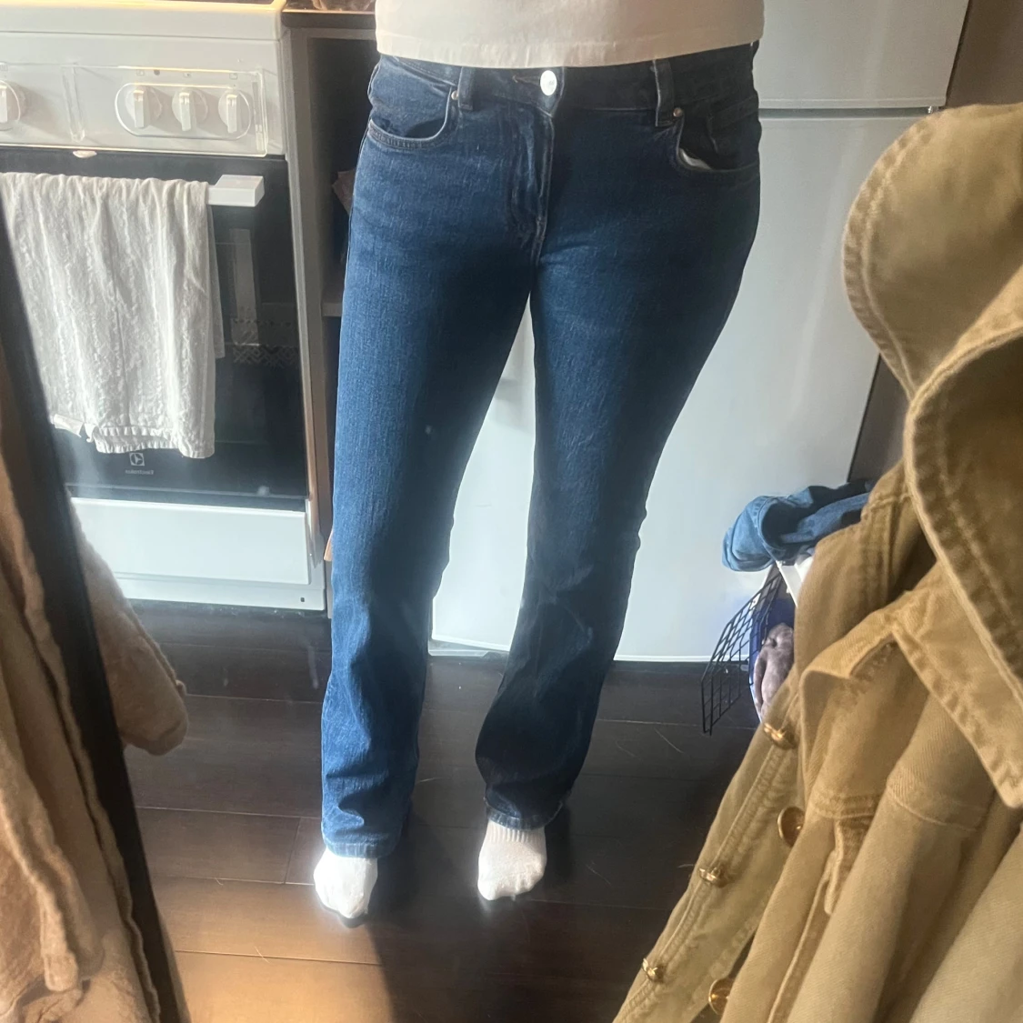 Säljer ett par klassiska jeans i mörkblå tvätt. De har låg/mid midja under naveln. Utsvöngda ben med lätt bootcut och femficksdesign. Jeansen är i ett mjukt och slitstarkt bomullsmaterial, perfekta för dig som gillar en tidlös och avslappnad look. Använda FÅTAL gånger pga de är snäppet för korta för mig💕passar även s/36